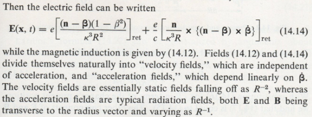 Anmerkungen: Die Gleichung für das elektrische Feld einer beliebig bewegten Ladung findet man z.B. in J.D. Jackson "Classical Electrodynamics" (1962, S.467):