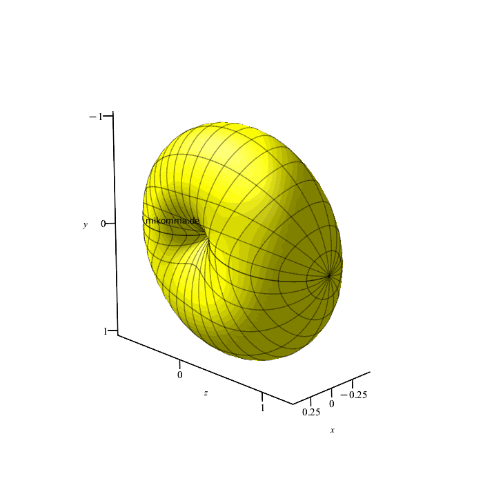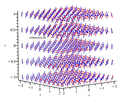 Die Ladung bewegt sich mit halber Lichtgeschwindigkeit in der x-y-Ebene auf einer Kreisbahn mit Radius 1. Die Richtungspfeile (B blau, E rot) geben nicht die Feldstärken wieder (Darstellung mit der Maple-Option fieldstrength = log[10]). Fortsetzung: Synchrotron B-Linien Empfehlung: In dem Programm "Radiation 2D" von Shintake (s.u.) kann man die Ladung mit der Maus bewegen. Hier ein paar Beispiele, die als Screenshots aufgenommen wurden: Literatur Shintake: Nuclear Instruments and Methods in Physics Research A 507 (2003) 89–92 © April 2023, Dr. Michael Komma (VGWORT) Links: Synchrotron B-Linien | Bremsstrahlung - wellenmechanisch | Hertzscher Dipol | Gaußstrahlen | Spontane Emission | Kaskade | Photogalerie | Photonenemission | Weisskopf-Wigner HOME | Fächer | Physik | Elektrizität | Optik | Atomphysik | Quantenphysik | Top
