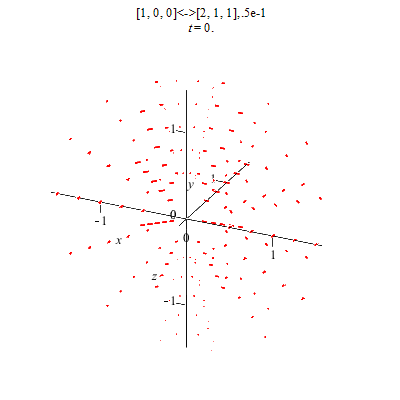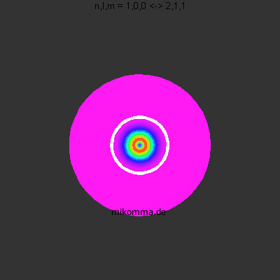 Die Simulationen in der oberen Zeile sind "stroboskopisch berechnet": In Wirklichkeit schwingt das Atom während eines spontanen Übergangs (hier mit zeitlich periodisch veränderlichen Gewichten der überlagerten Zustände) millionenfach - je nach Lebensdauer. Bei induzierten Übergängen kann sich der Vorgang aber auch erheblich verkürzen, was gerade in der modernen Attosekundenphysik immer mehr von Bedeutung wird. Es ist auch nicht ganz einfach, den Strom mit den Dichteschwankungen zu synchronisieren, weil das auch von der Wiedergabe des Browsers abhängt. Also bitte beim Betrachten der Bilder etwas Phantasie walten lassen: große Dichteschwankungen sollten zeitgleich mit großen Strompfeilen dargestellt werden (der Rechenaufwand für eine Überlagerung der Animationen wäre enorm hoch). Die weiteren Simulationen (rechts und unten) sind mit gleichen Gewichten der überlagerten Zustände berechnet, also im Maximum der Emission oder Absorption. |