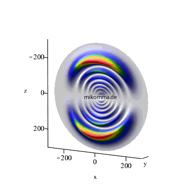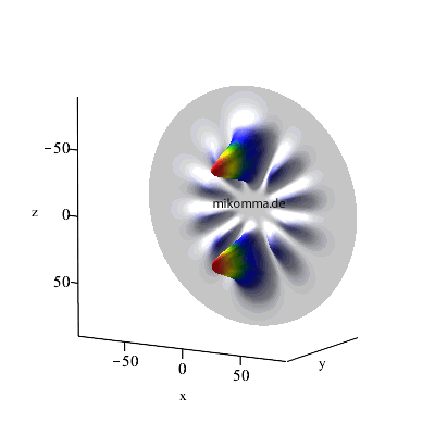 Bei diesen Bildern "sieht man den Strom" unmittelbar: der Schwerpunkt der Ladungsverteilung rotiert um den Ursprung, bis das Elektron im tieferliegenden Zustand angekommen ist, wobei es kontinuierlich strahlt, und nicht von einer Bahn auf die andere springt. Es bleibt aber auch nicht im tiefer gelegenen Zustand stehen, sondern setzt seine Reise fort bis in den Grundzustand, unter ständiger Emission elektromagnetischer Strahlung: Kaskade!