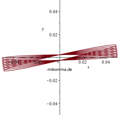 Wenn man die unterschiedliche Skalierung der Achsen (MKS-Einheiten) beachtet, kann man der Animation entnehmen wie weit sich die Schwingungsebene des Pendels im Inertialsystem und auf der Erde in fünf Schwingungen dreht. Dabei stellt man fest, dass die im Inertialsystem "rückwärts drehende Ellipse" im Vergleich zur Corioliskraft nur einen geringen Effekt hat. Mit anderen Worten: Wenn ein Foucault-Pendel "rückwärts dreht" (z.B. im Schulversuch), dann liegt das i.A. nicht an den Anfangsbedingungen ("schlechter Start"), sondern an Störungen, die sich im Laufe der Zeit aufsummieren (oder aufschaukeln) können. Lissajous-Pendel Die "intrinsische Präzession" des sphärischen