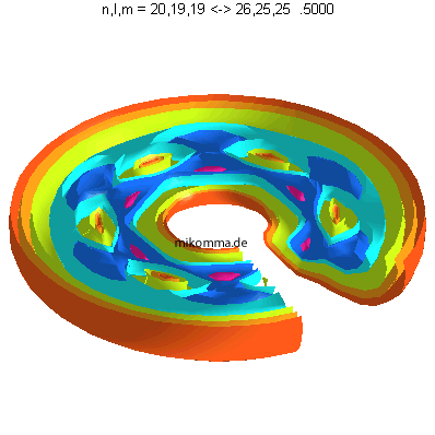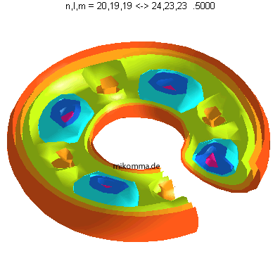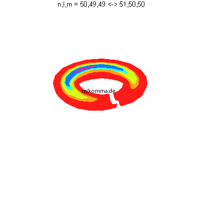 Rydbergatome (hochangeregte Atome) waren in früheren Jahren eher eine Kuriosität und wurden mehr in Gedankenexperimenten zum Bohrschen Korrespondenzprinzip erwähnt als in realen Experimenten verwendet. Nun sieht es so aus, als hätten Sie eine große Zukunft! Man will sie in Quantencomputern einsetzen aber es gibt auch Theorien, die in den Rydbergatomen zumindest einen Teil der dunklen Materie vermuten, nach der die Kosmologen suchen. Was haben Quantencomputer mit dem Kosmos zu tun? Rydbergatome leben extrem lang (könnten sich also für Quantencomputer eignen) und sind unsichtbar (im optischen Bereich - deshalb dunkle Materie). Hört sich doch spannend an? Leider müssen wir uns hier (und im Jahr 2005) mit Gedankenexperimenten begnügen, die sich aber schön veranschaulichen lassen: Überlagert man zwei Eigenfunktionen des (Wasserstoff-) Atoms, so beginnen die "stationären Zustände" zu laufen, und zwar mit der Schwebungsfrequenz der beiden Zustände, die für große Quantenzahlen der Umlauffrequenz eines klassischen Teilchens entspricht, z.B. so: Im akustischen Analogon wäre das die Grundschwingung einer Saite (ein Bauch und zwei Knoten), nur dass die Saite hier zu einem Kreis gebogen ist und rotiert. Die atomare Saite hat noch eine Besonderheit: der Bauch (violett) zerfließt während eines halben Umlaufs und versammelt sich wieder in der zweiten Hälfte. Ein Elektron auf Diätkur ist allerdings ziemlich schnell unterwegs - mit etwa einem Terahertz (10^12Hz). Es gibt noch eine Besonderheit im Vergleich zum klassischen Elektron, das immer auf genau einer Bahn läuft: Das quantenmechanische Elektron kann auf zwei Bahnen (und ihrer Umgebung) laufen - von Zeit zu Zeit zu sehen im ausgeschnittenen Sektor des Rings. Für ringförmige (kreisförmige) Rydbergatome sind die Bahndrehimpulsquantenzahl l und die magnetische Quantenzahl m maximal, also nur um 1 kleiner als die Hauptquantenzahl n. Wir wollen unser Gedankenexperiment mit diesen "unsichtbaren Gebilden" fortsetzen: Wie sehen diese "unsichtbaren Gebilde" aus, wenn sich die überlagerten Zustände in der Hauptquantenzahl um mehr als 1 unterscheiden? Die Filme zeigen die Überlagerung der genannten Zustände (n,l,m) mit gleichem Gewicht.