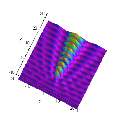 Mit dem Realteil der Eigenfunktion kann man aber die Wellen laufen lassen (dargestellt ist das Quadrat des Realteils). Sehen Sie alles, was oben in der klassischen Behandlung der Rutherfordstreuung erwähnt wurde? Lokalisiert das Atom das Elektron oder das Elektron das Atom? |
